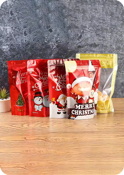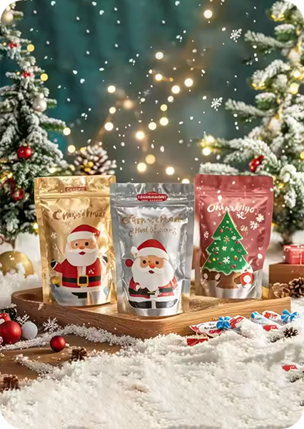 Small or large custom Christmas packaging bags should be simple for shoppers and safer around kids when needed. If you are packing snack mixes, candy mixes, tea blends, or bath salts, choose a standard press-to-close zipper.