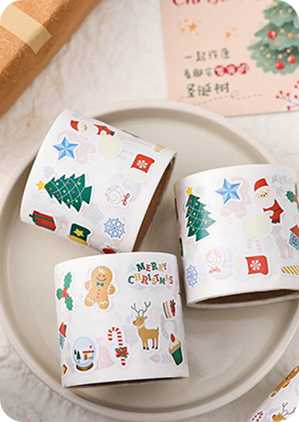 Die-cutting allows Christmas tree stickers, star seals, and custom-shaped gift tags that match brand art.