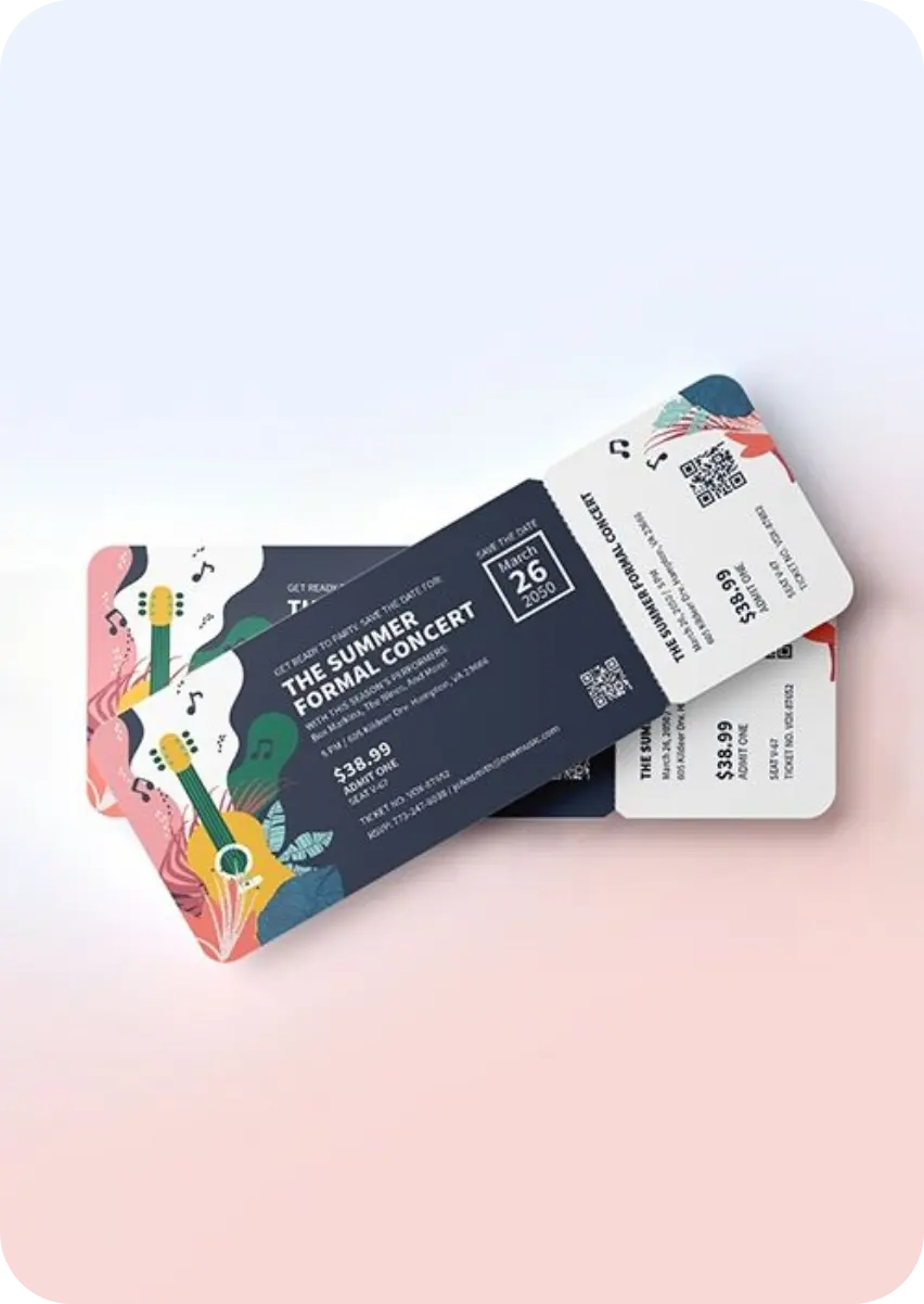 Don"t rely on the Sone-size-fits-all⬠template when we are offering you the opportunity to personalize your tickets" size, layout, and design. We have a proficient team of designers who are here to offer you free design support. From bold, high-definition logos and vibrant color schemes to specific event details and sponsor advertisements, you have total creative control.