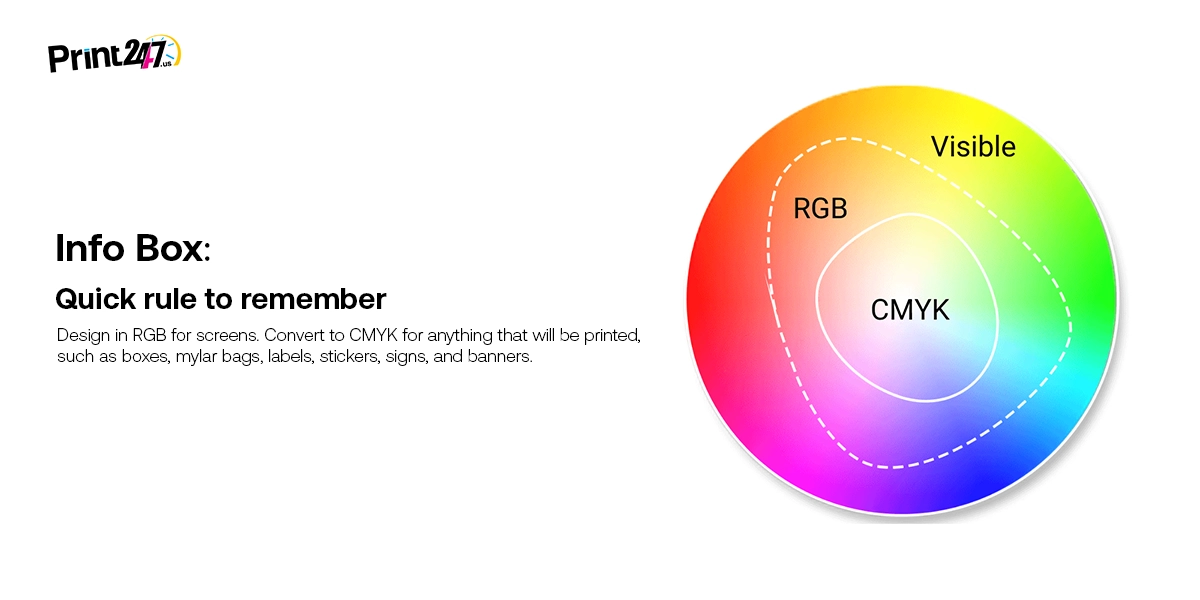 Use CMYK for any project that will be printed. That includes folding cartons, mailers, mylar pouches, pressure-sensitive labels, stickers, catalogs, and signs. Convert artwork to CMYK early, then choose inks and paper with your print vendor. This keeps color shifts small and predictable.