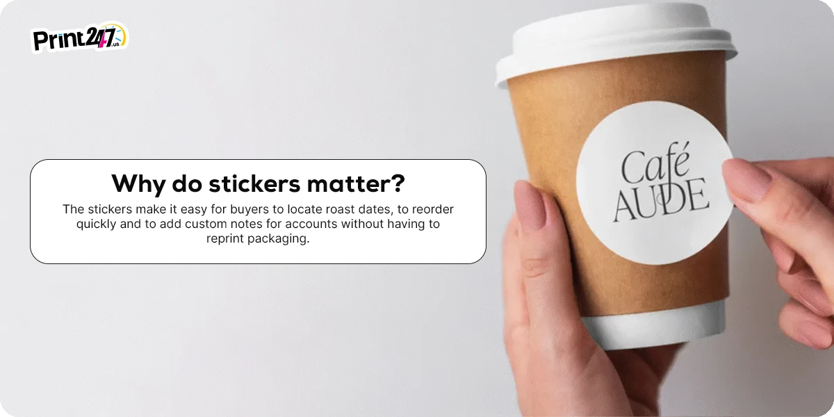 Stickers do more than show a logo. They are a cost-effective tool and play a vital role in quick coffee branding. They contain vital data, create consistent brand moments, and let you make fast changes without reprinting your primary pack. A sticker can display the roast date, a batch number, a cafe code, or a special promo. It allows workers to confirm freshness, rotate stock, and reorder correctly.