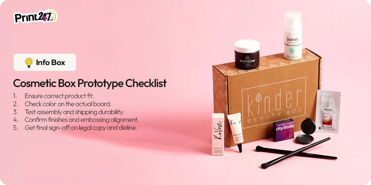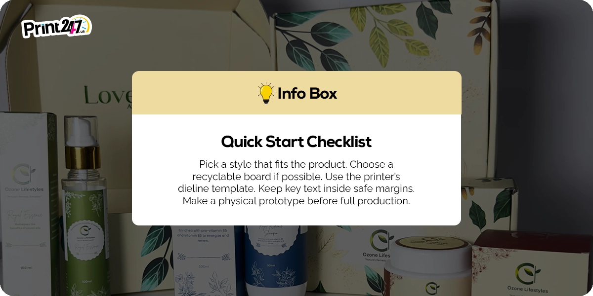 Designing custom cosmetic boxes involves choosing the right style, selecting the right materials, creating a precise dieline, ensuring clear graphics, providing honest copy, and ensuring the finishes match your brand. Working with Print247 for final production, eco choices, and reliable delivery helps you test prototypes, check regulatory information, and ensure compliance.