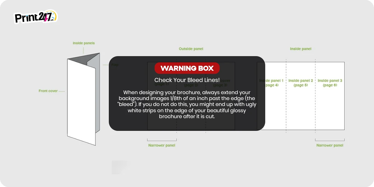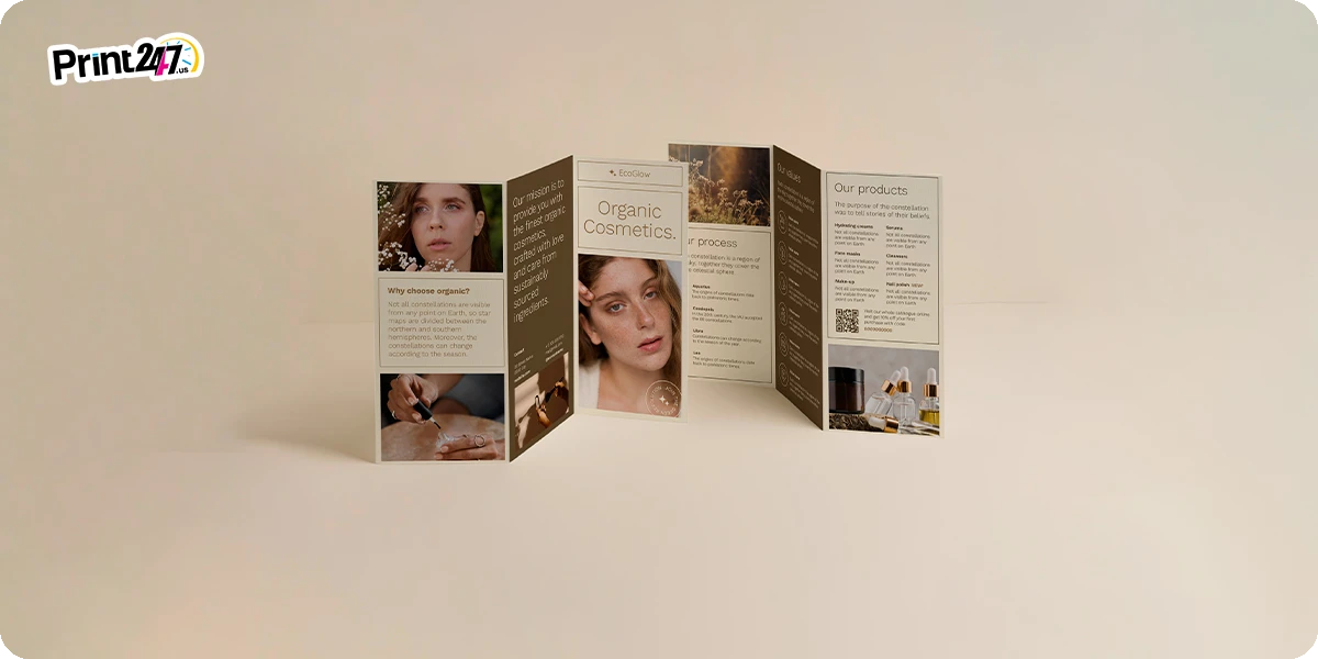- Z-Fold Brochure (8.5″ x 11″): Looks like a fan or an accordion. It opens up to show a big image across three panels. Great for charts or timelines.