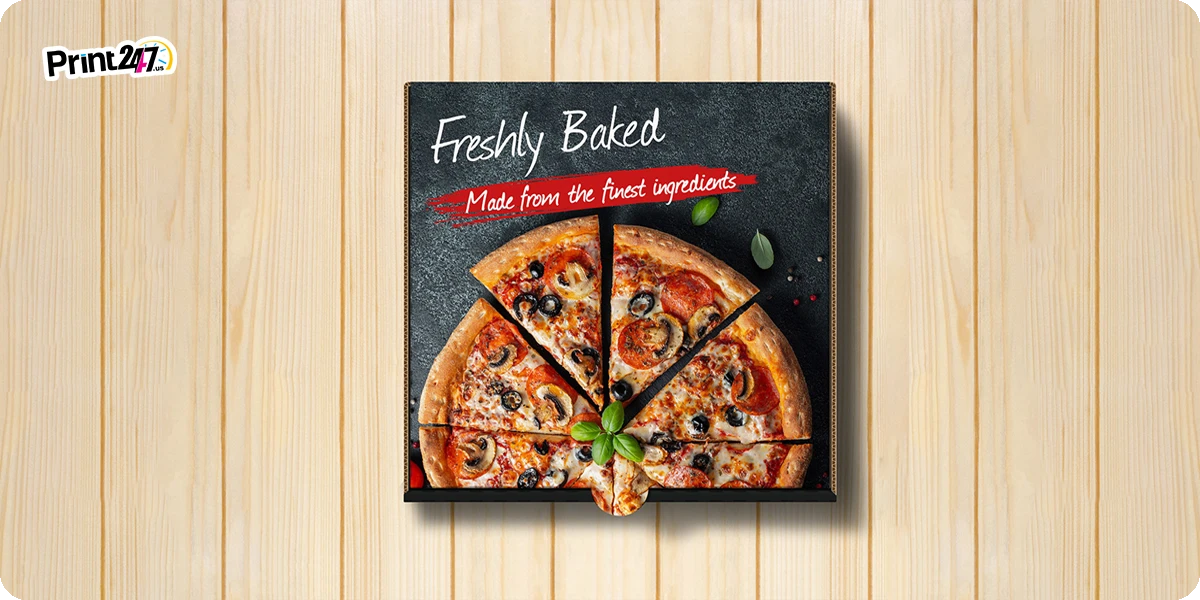 The decision to use Gloss or matte lamination comes down to personal branding. At Print247, we are committed to delivering you top-tier pizza boxes. Both mockups help you explore and feel the differences before ordering a large batch. This ensures that your packaging reflects your brand and resonates with your customers. Our food-grade printing and packaging ensures that your customers are satisfied with your brand. Reach out to our experts as we are servicing in all of the United States for catering your packaging and printing needs.