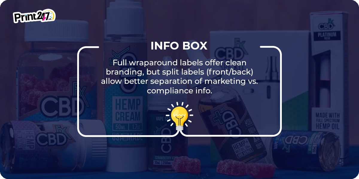 Full-wrap labels offer uninterrupted branding but can make compliance info harder to find. Split labels make it easier to separate marketing content from legal details. Choose based on your branding and layout needs.