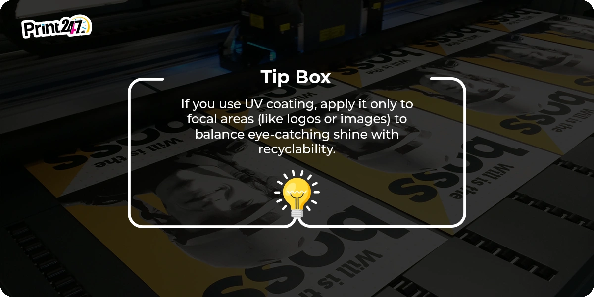 If eco credentials matter, prioritize water-based coatings (aqueous) and avoid coatings that reduce recyclability. Use finishes like debossing or matte, which don’t block recycling. When foil or gloss is essential, apply it to minimal areas only.