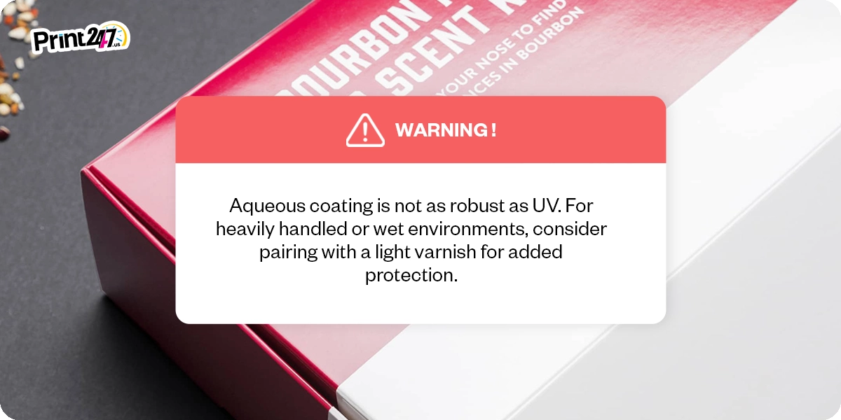 Aqueous is a water-based coating that can finish matte or glossy, depending on the formula. Eco-conscious brands love it because it’s low in solvents, dries fast without harsh fumes, and usually works well with recyclable materials. It’s protective, keeping prints safe from dirt and minor moisture, but still leaves the packaging easy to recycle.