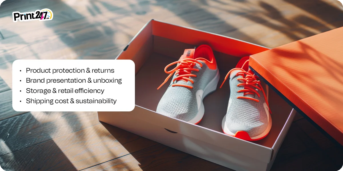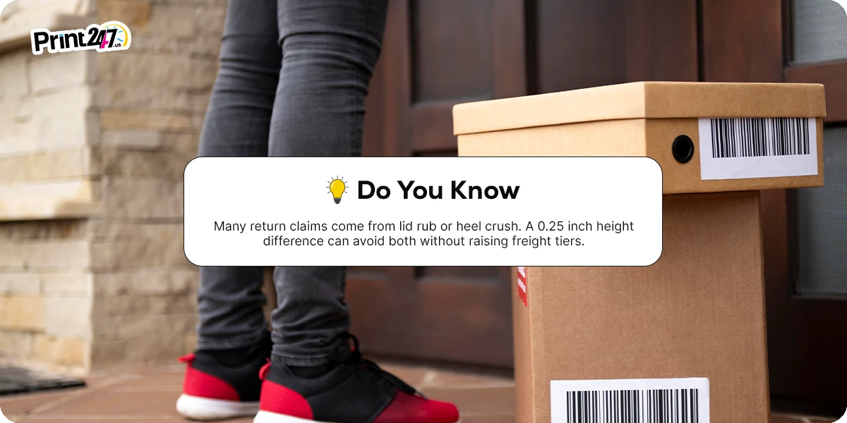 If you want help, order from Print247. We supply U.S. brands with custom footwear boxes and mailers that look great and work hard. Our services include free design assistance, eco-friendly materials, fast shipping, and the ability to see samples in person. There are fewer headaches on launch week when your teams get boxes that fit, budgets that match, and budgets that hold.
