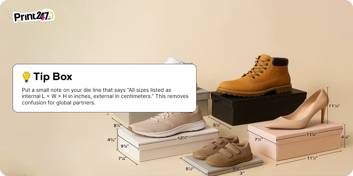 Understanding the packaging language is highly essential before you choose the right box for your shoe brand and calculate dimensions. It is common for teams to speak past each other when it comes to size. There is a misconception about the size of net boards among printers. The operations team wants inside space. Carriers are rated by the outside. Use one format across teams, and your numbers stay clean.