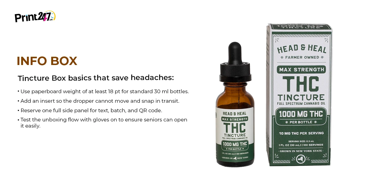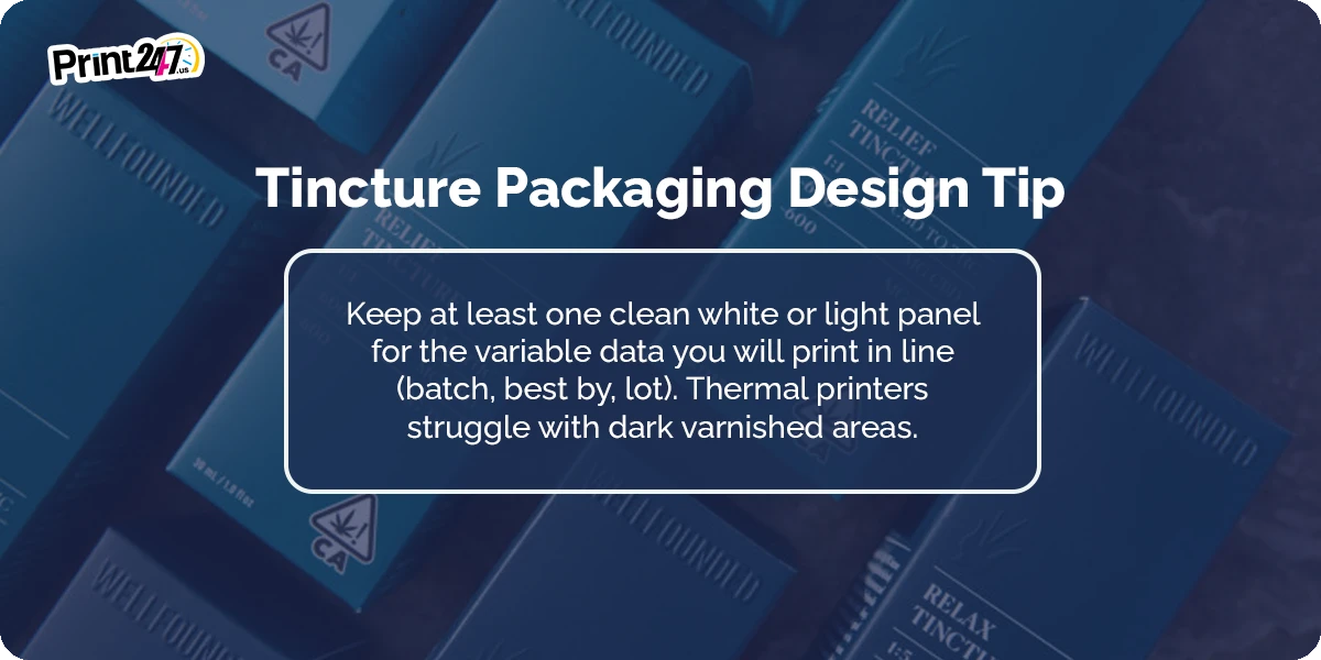 Tincture labels cause more fines than bottles ever will. You need to cover THC per serving, total THC per container, net contents, batch and lot numbers, license number, manufacture or pack date, warnings, universal symbols, and often a QR code that is sent to the COA. Minimum font sizes and panel placements are common rules. Keep all legal text in a high contrast color so it is easy to read. You can also read our article about packaging and labelling requirements for tincture boxes.