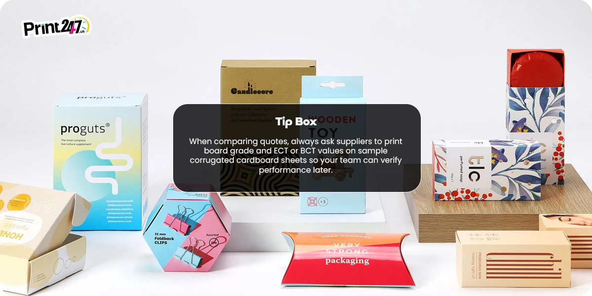Apart from the thickness of the cardboard box, strength is also an essential factor in this journey. The reason is that strength largely determines real-world performance. Thickness alone doesn’t guarantee durability. Not specifying it correctly can damage your product and increase shipping costs. Ask renowned packaging suppliers like Print247 to quote ECT or BCT ranges for corrugated board sheet options and bending stiffness for paperboard. Build a small table for your team linking product weight to board performance.