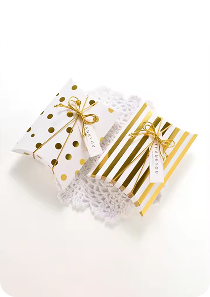 As soon as customers touch pillow boxes for the holidays, they should feel like a gift. In addition to supporting heavier finishes, rigid cardboard options, white, silver, and holographic, allow you to print flat colors crisply. Printing in CMYK reproduces full-color art accurately, while Pantone ink accurately reproduces brand symbols exactly. As well as your logo, you can include your own greetings, wishes, and other customized messages. The addition of gloss lamination and soft touch lamination changes the tactile experience; logos and patterns are enhanced with spot gloss and 3D raised UV for an instant appeal on the shelf. The addition of embossing, deep embossing, and foil hot stamping to packing lines adds depth and a premium appearance without complicating the process.
